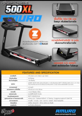 ลู่วิ่งไฟฟ้า AMURO รุ่น 500XL ลู่วิ่งตัวใหญ่ เชื่อมต่อแอป ZWIFT ได้ พื้นที่วิ่งกว้าง 52cm x ยาว 136cm พร้อมมอเตอร์ 4.5 แรงม้า ปรับความชันด้วยไฟฟ้า Auto Incline 18 ระดับ คุณภาพสูง Japan Quality (ค่าส่งสินค้าทั่วประเทศ 900 บาท ต่อชิ้น) *พื้นที่เกาะมีค่าบริการเพิ่มเติม กรุณาติดต่อเจ้าหน้าที่
