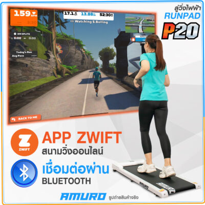 ลู่วิ่งไฟฟ้า AMURO รุ่น P20 ลู่วิ่งตัวเล็ก ประหยัดพื้นที่ ควบคุมด้วยรีโมท เชื่อมต่อแอป ZWIFT ได้ พื้นที่วิ่งกว้าง 38cm x ยาว 101cm มอเตอร์ 2.0 แรงม้า หน้าจอ LCD ขนาด 2.8 นิ้ว คุณภาพสูง Japan Quality (ค่าส่งสินค้าทั่วประเทศ 600 บาท ต่อชิ้น) *พื้นที่เกาะมีค่าบริการเพิ่มเติม กรุณาติดต่อเจ้าหน้าที่